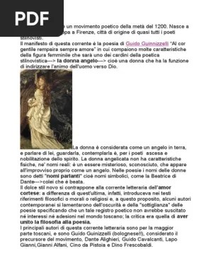 Riassunto nella seconda metà del duecento nacque, tra bologna e firenze, un nuovo movimento poetico e letterario definito da dante alighieri nella sua commedia " dolce stil novo " (oggi identificato anche come stilnovo , o stilnovismo )... Il dolce stil novo è un movimento poetico italiano sviluppatosi tra il 1280 e il 1310 a bologna ma maggiormente a firenze. Il dolce stil novo, non si basa sul bene.