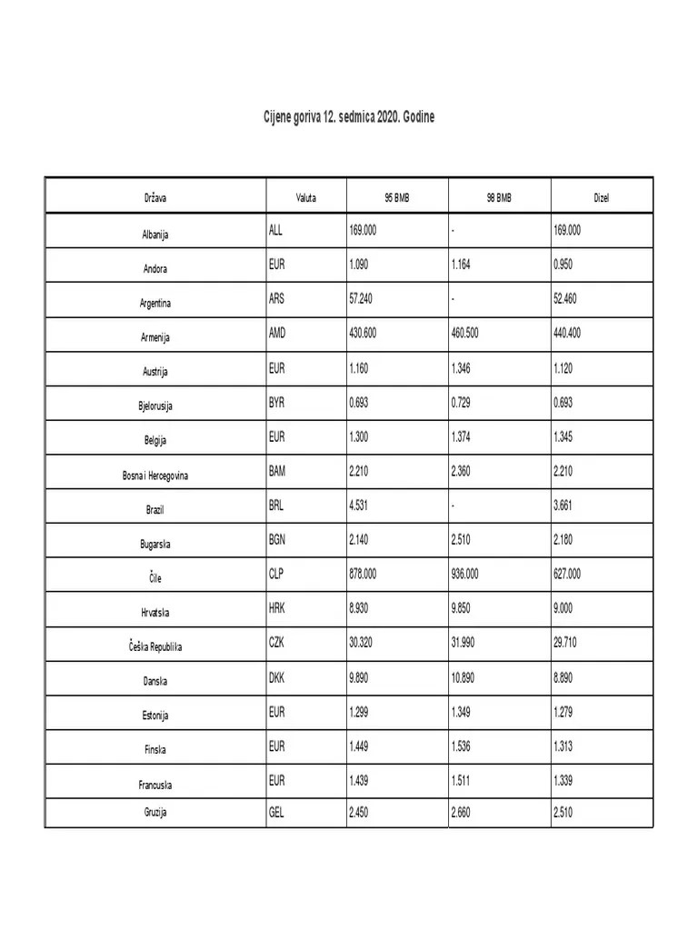 Trenutne cijene benzina bmb95 su od 2,29 do 2,42 konvertibilnih maraka, dizel ed5 2,25 do 2,35 km zavisno od regije i distributera. .. Poređenja radi, prosečna cena dizela u svetu u tom periodu je 14.58 turkish lira.